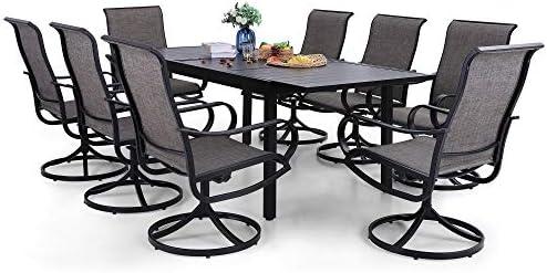 This outdoor dining arrangement offers an appealing blend of style and functionality, boasting an elegant extendable table and chic swivel chairs designed for leisure and comfort. Crafted with upgraded Textilene fabric mixed with Olefin, the chairs ensure durability, resistance to fading, and easy maintenance, making them ideal for various weather conditions. The powder-coated steel frame not only adds to the longevity of the set but also supports a weight capacity of up to 250 lbs, catering to different body types. Featuring a 360-degree swivel and gentle rocking motion, the chairs provide unparalleled comfort during meals or gatherings. the set’s minimalist design brings a contemporary touch to outdoor spaces.