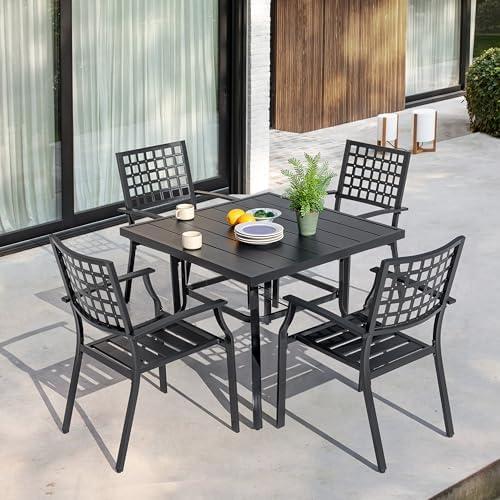 This outdoor dining set offers a combination of style and functionality, making it perfect for your patio, garden, or deck. The spacious 37″ square dining table can comfortably accommodate four or more people, allowing for leisurely meals with family and friends. The powder-coated finish ensures durability against various weather conditions, while the slatted tabletop design promotes quick drying and ventilation, keeping your dining experience fresh. Each chair features an ergonomic backrest and lattice accents, enhancing both comfort and aesthetics.