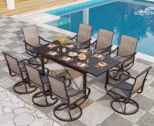 This outdoor dining solution is crafted for both comfort and style, incorporating a 60-inch square metal table that accommodates up to eight people, making it ideal for family gatherings or social events. The table features a powder-coated finish that enhances its sturdiness against various weather conditions. Paired with eight swivel rocking chairs designed for relaxation, these seats include high-density cushions that ensure hours of comfortable dining. Notably, the 360-degree swivel design allows easy conversation, enhancing the overall dining experience, whether indoors or outdoors.