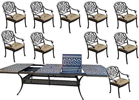 This high-quality outdoor ensemble boasts a robust construction of genuine cast aluminum, ensuring it will withstand the elements without rusting. The rectangular extendable dining table offers ample space, ranging from 48 x 84 inches to a generous 48 x 132 inches, accommodating up to ten people, making it perfect for family gatherings or outdoor parties. Each piece comes with bottom seat cushions for added comfort, and the stylish Desert Bronze finish adds a touch of elegance to any patio or backyard. With its low maintenance requirements, this set is designed for enduring use, allowing you to enjoy your outdoor space without the hassle of regular upkeep.