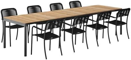 This outdoor dining set is designed to enhance your backyard or patio experience with its elegant combination of certified teak wood and durable aluminum. Crafted from high-quality materials, the table showcases a rich golden-brown finish that’s resistant to the elements, ensuring longevity and an impeccable appearance over time. With dimensions that comfortably accommodate up to eight people, this set includes an extendable rectangular table and eight stylish armchairs, perfect for family gatherings or entertaining guests.