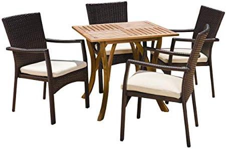 This exquisite five-piece dining arrangement features a stunning blend of acacia wood and faux wicker, creating an inviting atmosphere for your outdoor gatherings. The square table showcases a slat panel design and is crafted from durable acacia wood, ensuring long-lasting performance against the elements. Each of the four chairs boasts a chic brown wicker finish and comes with plush crème cushions made from water-resistant fabric, adding both comfort and style. With generous dimensions, it provides ample space for dining and entertaining, making it an ideal choice for any sun-soaked patio or garden.