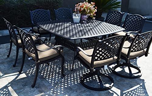 This outdoor dining ensemble features a timeless design that pairs elegance with comfort and durability. Crafted from high-quality cast aluminum, it boasts a five-stage powder-coated finish in an attractive antique bronze color, ensuring it remains rust-free for years. The set includes four swivel rocker chairs and four standard chairs, along with eight plush walnut seat cushions, providing ample seating for gatherings. The spacious 64″x64″ square table serves as a perfect centerpiece for family meals and social events, allowing for intimate conversations and shared experiences.