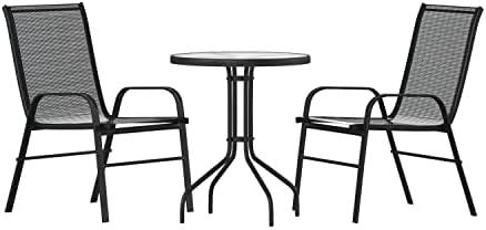 This outdoor dining set is perfect for creating a cozy dining environment on your balcony or patio. The 23.75″ round tempered glass table features a sleek designer rippled surface that is smooth, ensuring your items stay stable while enjoying meals or drinks outdoors. Accompanied by two black flex comfort chairs, designed with breathable material and curved arms for added comfort, this set is built to accommodate both relaxed dining and intimate conversations. The durable steel frame can support substantial weight, with the table boasting a capacity of 130 lbs and chairs up to 350 lbs, allowing users to dine with ease.
