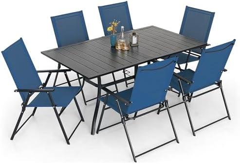 This versatile outdoor dining set features a 63″ x 38″ rectangular metal table paired with six blue folding chairs, making it an ideal choice for gatherings with family and friends. The table boasts a sleek black finish and is crafted from durable steel, ensuring it withstands the elements while providing a spacious area for meals and leisure. Each chair is designed for convenience, constructed from lightweight yet strong materials, allowing for easy mobility and storage. The textilene mesh fabric of the chairs offers excellent breathability and comfort, making it perfect for long afternoons spent outdoors.