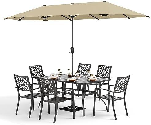 This patio dining set combines functionality and style, featuring a robust metal table with a sleek e-coated frame designed to withstand the elements. Measuring 60″L x 38″W x 28″H, the rectangle table offers ample space for family and friends. The set’s six stackable chairs, each capable of supporting up to 300 lbs, are both rust and weather-resistant, ensuring long-lasting durability. With a comfortable seat height of 17 inches, they provide an enjoyable dining experience. The included 13-foot double-sided umbrella, made from 180g polyester fabric and featuring a humanized crank design, creates extensive shade, keeping your family protected during sunny days.