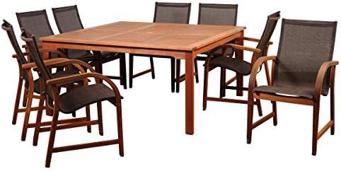 This patio dining set features an elegant design crafted from high-quality Eucalyptus Grandis wood, sourced from sustainable forests in Brazil. Its stunning brown finish not only enhances its aesthetic appeal but also ensures longevity and sturdiness, making it a worthy addition to any outdoor space. The set comfortably seats up to eight people, perfect for gatherings. Accompanied by a square table and eight armchairs, it invites family and friends to enjoy meals together while adding an elegant touch to your patio or backyard.