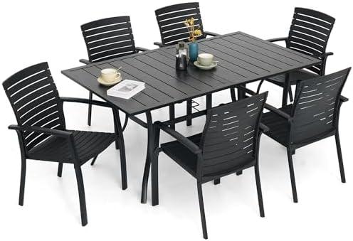 This dining set combines durability and style, featuring six stackable chairs made from resilient resin plastic with an aluminum frame, all coated for rust resistance. The lightweight materials make it easy to move around, while the ergonomic design ensures comfort, making it a great choice for outdoor meals or gatherings. The rectangular table, measuring 63” x 38”, comes with an umbrella hole for those sunny days, allowing you to enjoy your outdoor space without the heat. The set is designed for easy assembly, with included tools, making setup a breeze for any homeowner.