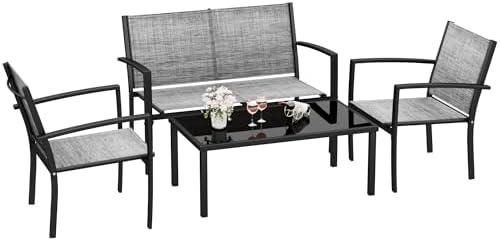This 4-piece patio conversation set offers a stylish solution for outdoor comfort with its combination of a loveseat, two chairs, and a coffee table. Featuring a waterproof screw protector design, it ensures the longevity of the furniture by preventing screws from being exposed. The powder-coated steel tube frame provides robustness and can withstand up to 330 pounds, protecting against rain and other weather conditions. Additionally, the breathable textilene material used for the seats and backs enhances comfort, making it perfect for hot summer days. The modern aesthetic seamlessly integrates into various outdoor settings such as patios, balconies, and gardens.