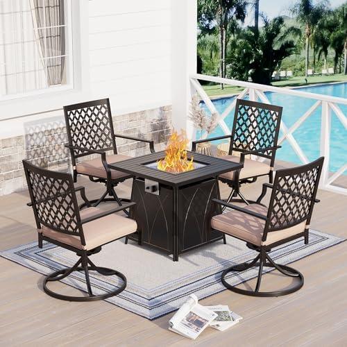 This outdoor furniture set offers a combination of comfort and practicality that enhances any patio experience. Constructed from a high-quality metal frame with weather-resistant powder coating, it ensures durability for year-round use. The set includes a versatile gas fire pit table, providing a cozy 50,000 BTU heating output perfect for chilly evenings, while also serving as a dining table in warmer months. The four swivel chairs feature high-density cushions that provide excellent seating comfort. Furthermore, the 360-degree swivel design allows for effortless conversation with friends and family gathered around the fire pit.