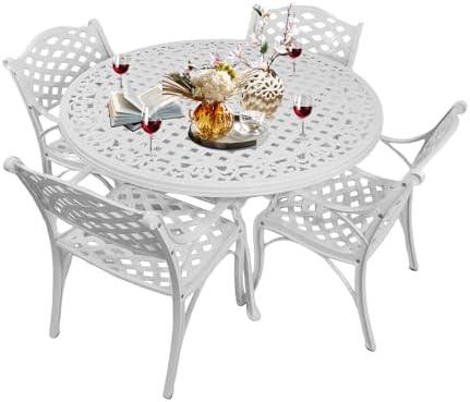This exquisite patio dining ensemble features a 48″ round table paired with four elegantly designed bistro chairs, all crafted from high-quality cast aluminum. The set is not only visually appealing with its classic, elegant finish, but it also boasts impressive durability due to its powder-coated surface, which provides excellent rust and water resistance. Its ergonomic design is a standout feature, with high backrests that support your body and alleviate back pressure—perfect for long, leisurely meals outdoors. The furniture is designed to endure various outdoor conditions, maintaining its beauty and functionality over the years without fading or deforming.