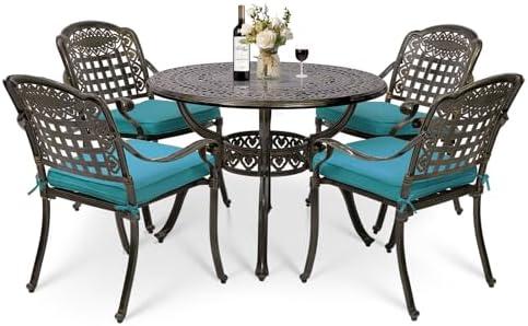 This patio dining set includes a round table, four chairs, and four comfortable cushions, making it an ideal choice for outdoor gatherings in your backyard or garden. The durable cast aluminum construction ensures longevity and resistance to rust, while the powder-coated surface enhances maintenance ease. With a 2-inch diameter umbrella hole in the center of the table, you can effortlessly add a patio umbrella for those sunny or rainy days, providing necessary shade while you enjoy the outdoors. The contoured chair design with curved armrests enhances comfort during long meals or casual lounging, allowing you and your guests to sit back and relax.