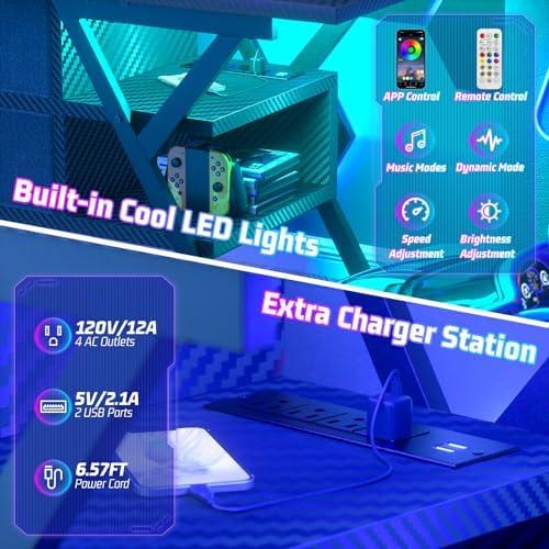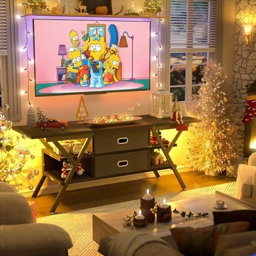 In considering if this TV stand meets our needs, we appreciate its versatile design and functionality. The built-in power station with four AC outlets and two USB ports allows us to easily charge all our gaming devices and accessories, making it a perfect hub for our living room or bedroom. Furthermore, the RGB LED lighting, which can be adjusted via remote or app, adds a trendy touch and mood-setting capability, enhancing our viewing experience during movie nights or gaming sessions. Its spacious storage options include three shelves and two fabric drawers, providing ample room for everything from game consoles to board games, which we find incredibly useful.