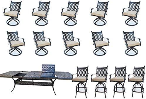 Designed for both elegance and durability, this outdoor dining set features a combination of a rectangular extension table and versatile seating options. The set includes a spacious extension table that can be adjusted from 48″ to 132″ and is complemented by ten comfortable swivel rockers and four stylish bar stools, all equipped with bottom cushions in a serene Sesame color. Made from high-quality cast aluminum, the frames boast a rust-resistant design that holds up well to the elements, further enhanced by a five-stage powder-coated finish. The Desert Bronze color adds a touch of sophistication, making it a perfect addition to any patio or backyard setting.