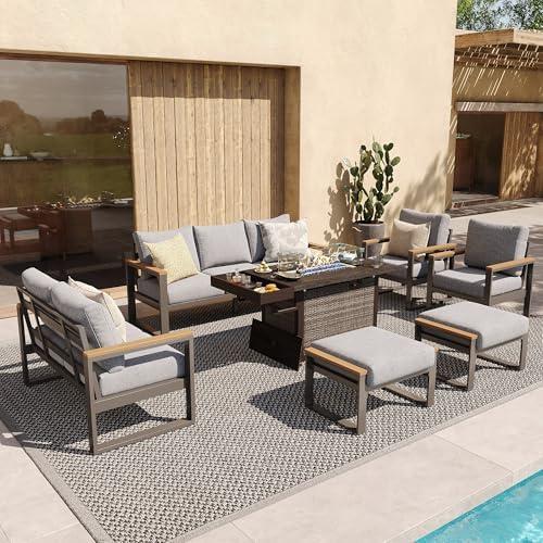 This outdoor wicker furniture set offers a delightful combination of comfort and functionality, featuring a roomy sectional design that can comfortably seat up to ten people. Hand-woven by skilled artisans using thick-ribbed and high-grade PE rattan, the set underlines durability while showcasing aesthetic appeal through its elegant floral armrests. Additionally, the versatile propane fire pit table enhances outdoor entertaining by providing a warm and inviting atmosphere with a powerful 50,000 BTU heat output, which can also serve double duty as a coffee table when the lid is attached.