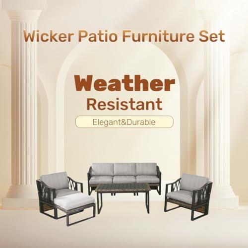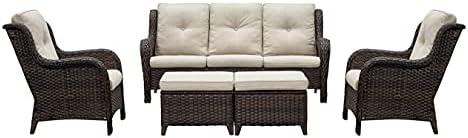 This 5-piece wicker patio seating arrangement is designed for comfort and versatility, featuring a spacious 3-seat couch, two armchairs, and two ottoman footrests. The hand-woven, all-weather rattan and sturdy steel frame can support up to 350 lbs, making it a reliable choice for outdoor gatherings or cozy evenings on your porch. The cushions are made of breathable, anti-UV polyester fabric, ensuring they withstand the elements while providing a soft, supportive seat.