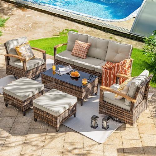 This versatile furniture collection includes two swivel rocker chairs with natural wood armrests, a spacious three-seat sofa, two convenient ottomans, and a sleek coffee table, all designed to enhance your outdoor experience. The ergonomic design of the rocking chairs not only offers 360-degree rotation but also features wide seating and thick cushions that provide exceptional comfort. The high-quality PE rattan and powder-coated metal frame ensure durability and resistance against the elements, making this set ideal for any outdoor space, whether it’s a patio, porch, or garden.