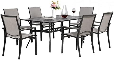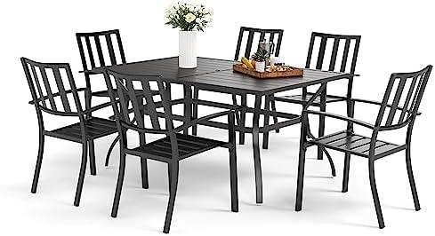 This versatile outdoor dining set includes a rectangular table designed to comfortably seat up to six individuals, making it perfect for family dinners or gatherings with friends. The substantial table measures 60 inches in length and is paired with six robust steel striped armrest chairs that combine style and functionality. Each chair is stackable, optimizing storage space and allowing for easy transport. Crafted from heavy-duty metal with a durable e-coating, this dining set is rust and weather-resistant, ensuring longevity without the need for special maintenance.
