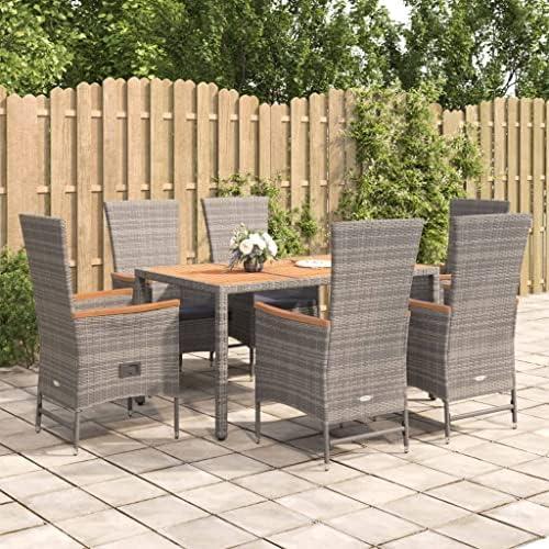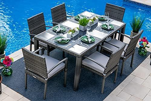 This outdoor furniture set effortlessly combines traditional wicker style with contemporary durability. Constructed using powder-coated aluminum frames and weather-resistant resin wicker, it not only looks elegant but also withstands the elements, ensuring longevity in various weather conditions. The centerpiece is a tempered glass dining table (69″ L x 40″ W x 29.5″ H), complemented by six cushioned armchairs (24″ L x 22″ W x 33.5″ H) that provide comfort even during prolonged use. Assembly is straightforward, requiring just 1 to 2 hours, and maintenance is a breeze as cushion covers are machine washable and the wicker can be cleaned with mild detergent.