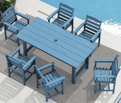 This 7-piece dining set is perfect for family gatherings, seamlessly blending style and functionality. The spacious table, measuring 66.9″D x 32.3″W x 29.1″H, features a built-in umbrella hole that provides shade during sunny days, ensuring you can enjoy outdoor meals comfortably. Made from high-density polyethylene, this set is designed to withstand various weather conditions while offering a low-maintenance solution. Each dining chair, constructed with ergonomics in mind, supports a weight capacity of up to 300 lbs, providing comfort during long meals and gatherings.