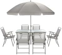 This modern dining set elevates the aesthetics of any outdoor area with its stylish design and practical features. The glass-topped table is complemented by six foldable chairs, making it perfect for casual gatherings or formal events outside. Crafted from sturdy steel and finished in grey, this set is both visually appealing and highly durable. The textline seating ensures added comfort while enjoying meals outdoors. Measurements for the chairs are approximately 20.87″ wide by 23.62″ deep and 35.43″ high, while the table measures 55.12″ wide by 31.5″ deep and stands at 28.35″ high, creating an ideal setup for various outdoor spaces.