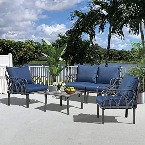 Stylish 4-Piece Outdoor Seating Set with Navy Blue Cushions