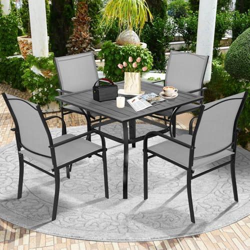 This versatile patio furniture set offers an ideal blend of durability and style for your outdoor space. Constructed from heavy-duty steel, the framework is designed for longevity while resisting rust and scratches thanks to a high-performance powder coating. The large 37×37 inch tabletop is perfect for enjoying meals or drinks, and its weather-resistant surface ensures year-round use. Each of the four textilene dining chairs features a curve design for ergonomic lumbar support, allowing for comfortable lounging. With smooth armrests included, this set caters to relaxation, whether on the patio, in the garden, or by the poolside.