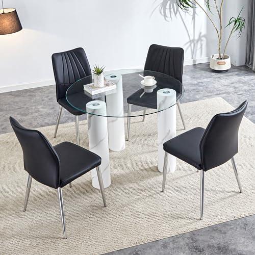 This dining table combines a sophisticated design with practicality, making it a perfect addition to any dining room, kitchen, or living area. The round tempered glass top is not only aesthetically pleasing but also functional, featuring a smooth surface that is easy to clean with just a damp cloth. With MDF cylindrical legs offering superior strength and durability compared to solid wood, this table stands firm without warping from temperature or humidity changes. Its rounded edges ensure safety while adding a modern touch that fits seamlessly with various interior styles.