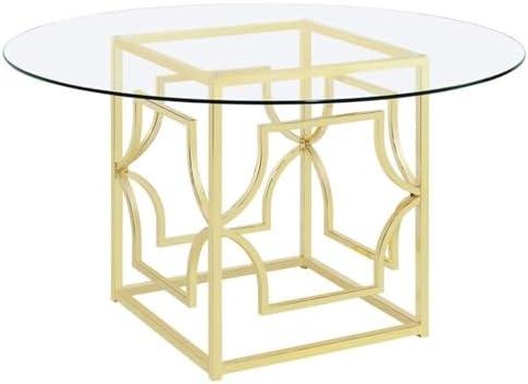 This modern dining table features a clear tempered glass top that brings a bright and open feel to your dining area, making it an eye-catching centerpiece. The contemporary metal frame is accentuated by a retro brass finish, offering a unique charm that can seamlessly blend with various decor styles. It’s not only visually appealing but also practical, as the glass surface is easy to clean and maintain. The table stands at a comfortable height of 30.25 inches, making it perfect for intimate dinners or lively gatherings.