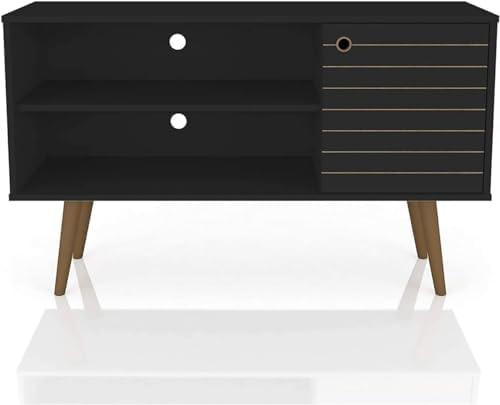 This elegant furniture piece is perfect for enhancing both living rooms and bedrooms, showcasing a mid-century modern aesthetic with its solid wood splayed legs. It fits televisions ranging from 32″ to 46″ and features a versatile design that integrates seamlessly into various decor styles. With a combination of a concealed cubby and two open shelves, it offers ample organization space for electronics, DVDs, board games, and other media accessories. The addition of two wire management holes ensures a clean and clutter-free look, making it an excellent option for a tidy entertainment area.