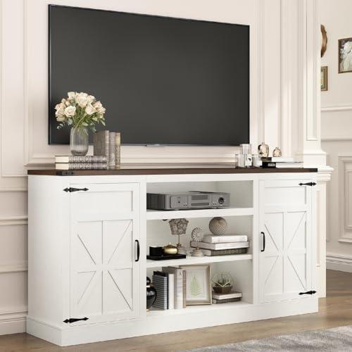 The beautiful white media console stands out with its rustic charm and functional design. Equipped with two USB ports and two outlet ports, it offers convenient power access for your media devices, eliminating the hassle of reaching for hidden sockets. This entertainment center features a spacious layout that accommodates TVs up to 75 inches and includes multiple adjustable shelves, providing flexible storage options for various items like electronics, books, and decor pieces. The dedicated cable management system helps keep cords organized, making it a stylish yet practical addition to your living room.