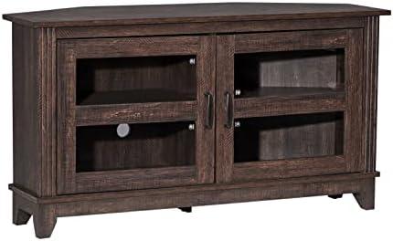 This stylish corner entertainment center is designed to make the most out of your living room space while providing a chic farmhouse aesthetic. With a flat top surface that accommodates TVs up to 48 inches and a rich, dark espresso finish, it seamlessly blends with various decor styles. Measuring 16 by 44 by 23 inches, its space-saving design allows it to fit perfectly in the corner of your room, enhancing both form and function. Constructed from high-grade MDF and durable laminate, this console is not only visually appealing but also sturdy, supporting up to 250 pounds.