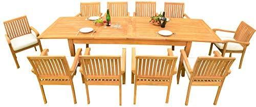 This outdoor dining set features an elegant 118-inch double extension table paired with ten stacking arm chairs, combining style and functionality. The table includes a convenient 2-inch umbrella hole, complete with a wooden cap to cover the hole when not in use. Crafted from select kiln-dried teakwood, the set boasts durability, with stainless steel components that enhance its aesthetic appeal. The chairs, designed to stack easily, offer a space-saving solution for limited storage areas. Additionally, the unique dual butterfly extension system allows for versatile seating arrangements, accommodating gatherings of various sizes with ease.