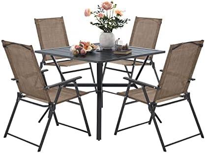 This set includes a square metal table and four portable chairs designed for backyard spaces, combining aesthetic appeal with practical functionality. The classic slatted tabletop ensures timeless style while providing a stable surface for dining. Crafted from high-quality materials, the metal frame is treated with an anti-rust powder e-coating, making it durable and resistant to outdoor elements. Each chair is lightweight and ships fully assembled, offering easy setup and versatile usage whether for dining or lounging. Additionally, the presence of an umbrella hole adds to the convenience, allowing users to enjoy shade during sunny days.
