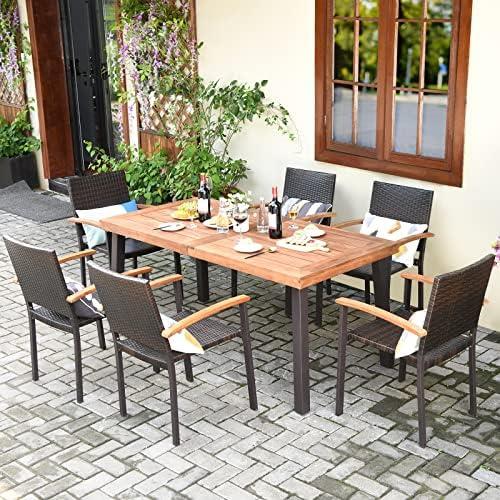 This outdoor dining collection combines elegance with practicality, featuring a rectangular table complemented by six comfortable rattan chairs. Crafted from a powder-coated steel frame, solid acacia wood, and all-weather PE rattan, this set provides excellent stability and durability. Notably, the rattan chairs include ergonomic backrests and wide armrests for a comfortable seating experience. When not in use, the stackable design of the chairs allows for easy storage, making this set ideal for patios, gardens, and poolside areas. Additionally, the table comes with an umbrella hole, perfect for adding shade on sunny days.