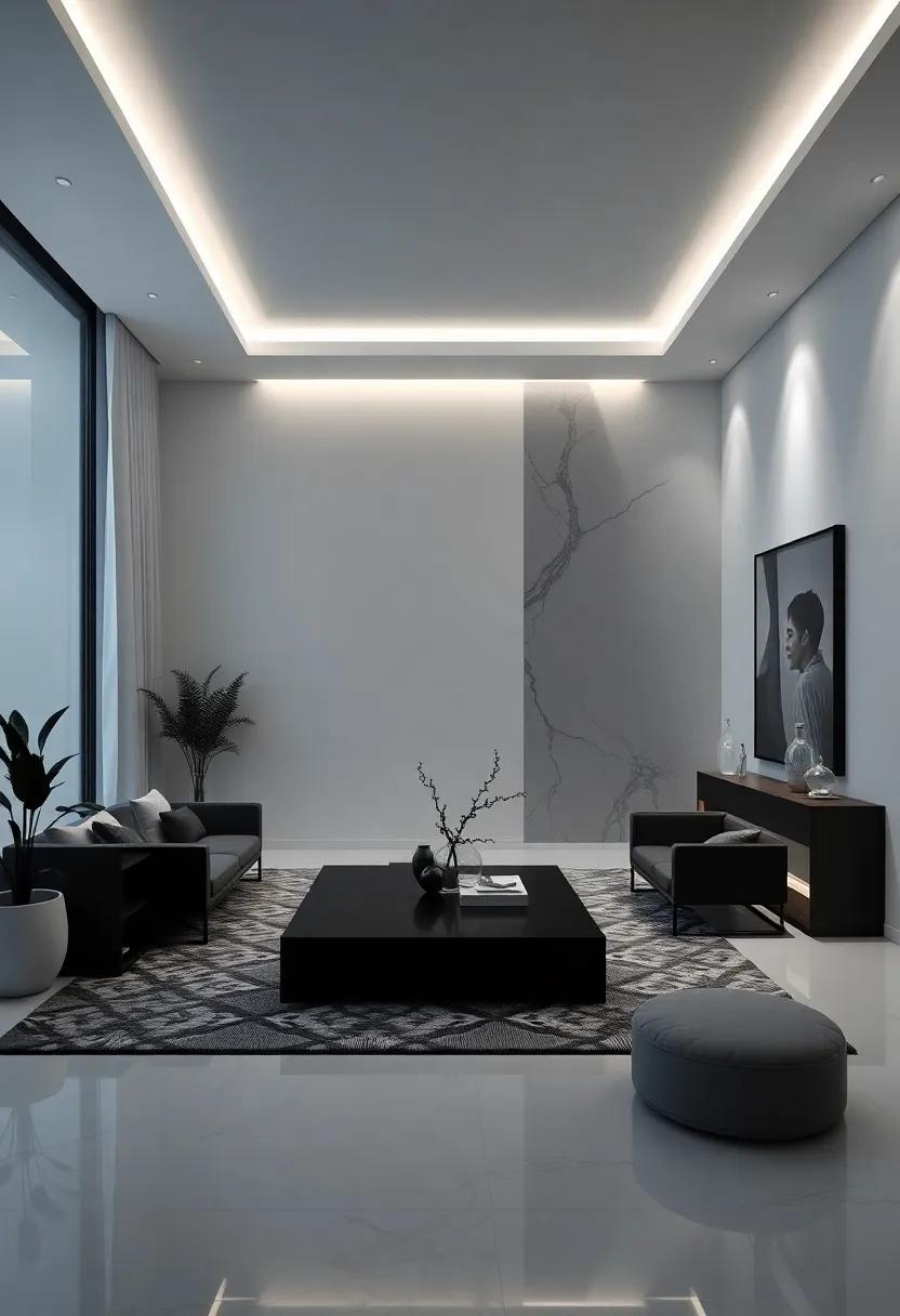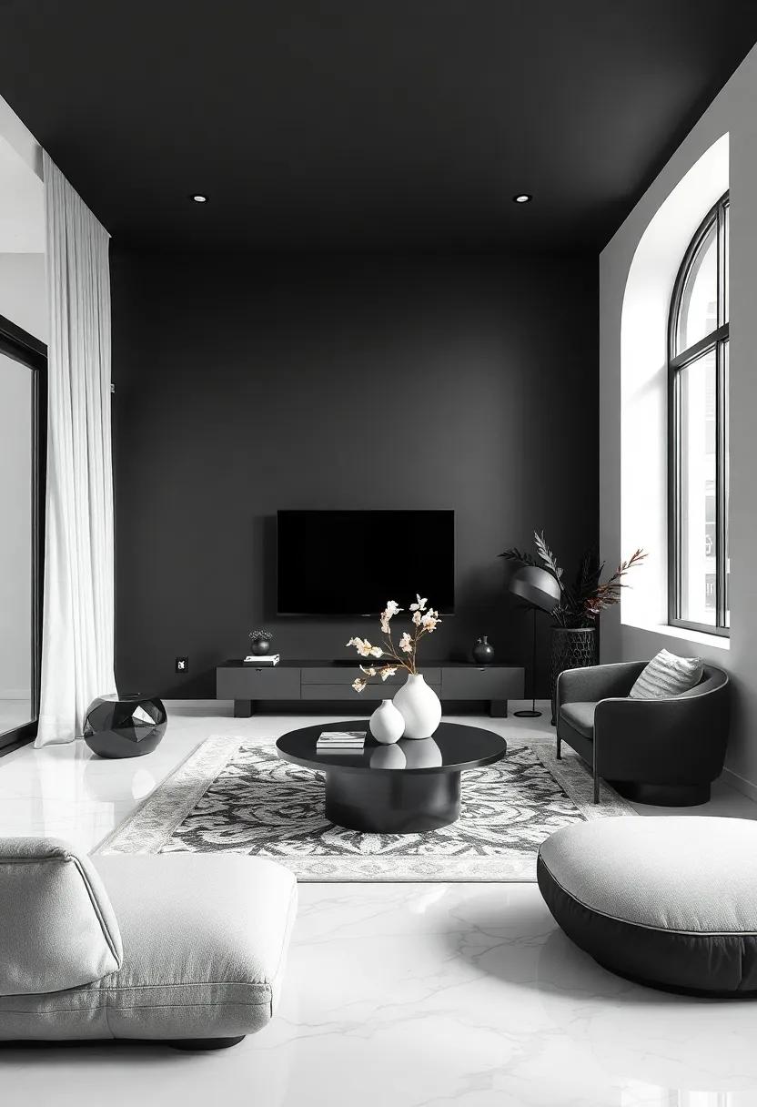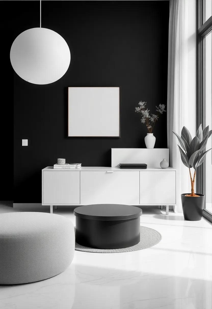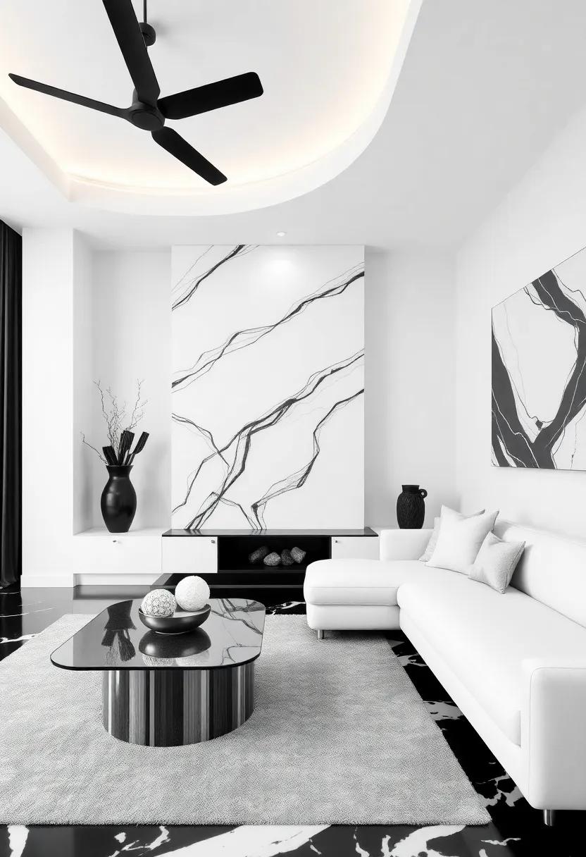 - Textiles: Layer unique fabrics, such as a plush black velvet throw or a geometric white rug, to add depth and comfort.