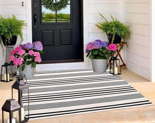 BUAGETUP Black and White Outdoor Rug 3’x 5′ Hand-Woven Cotton Washable Rug Striped Front Porch Rug ‌Machine ​Washable Indoor/Outdoor Area Rug Floor Mat for⁤ Farmhouse/Layered Door Mats/Living Room