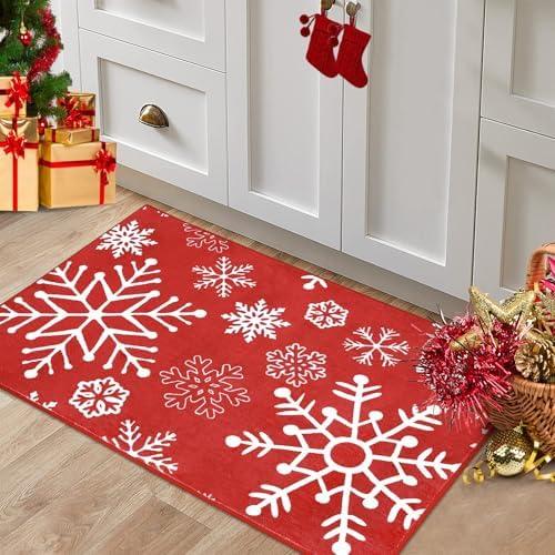 Christmas Entryway Rug Xmas Snowflake Pattern Small⁤ Rug Carpet Non-Slip Stain Resistant Holiday Decorative Washable Floor Cover Accent Rug for Entrance ‍Kitchen Bathroom, Red, 2×3⁣ Feet