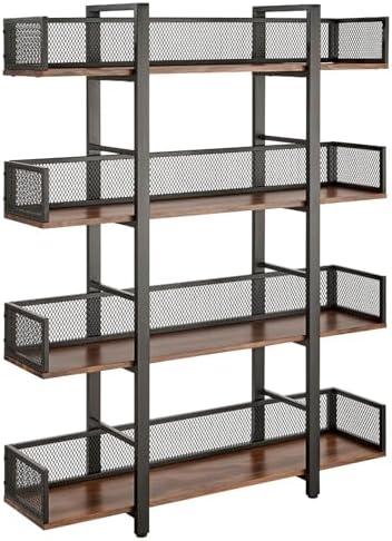 This elegantly designed shelving unit seamlessly blends modern industrial aesthetics with its striking mesh barriers, making it a sophisticated addition to any room. Its unique light walnut brown semi-gloss finish enhances the natural grain of the solid pine wood, creating a visually appealing piece that stands out in any environment. With ample space across its four tiers, it offers generous storage for books, decorative items, and personal valuables, making it perfect for a bedroom, office, living room, or classroom.