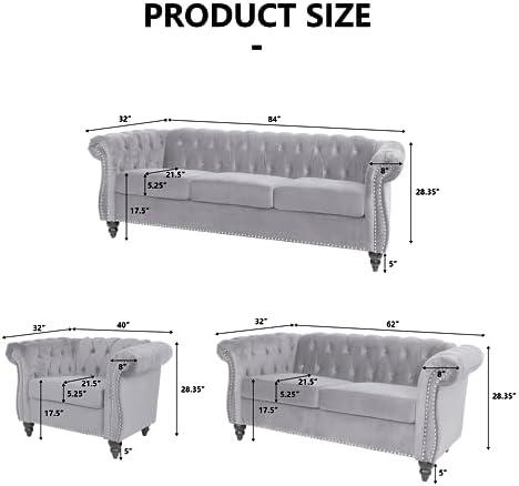 Our experience with this living room furniture set has been nothing short of delightful. The traditional Chesterfield style exudes elegance with its deep button tufting and nailhead accents, making it a stunning focal point in our living room. We appreciate the scrolled arms and turned legs that enhance its classic look. Not only does it serve as a stylish addition to our decor, but the high-quality velvet material feels luxuriously soft while being resistant to wrinkles. The upgraded high-density foam cushions ensure that we sink into comfort without worrying about deformation over time, making it an ideal spot for relaxation after a long day.