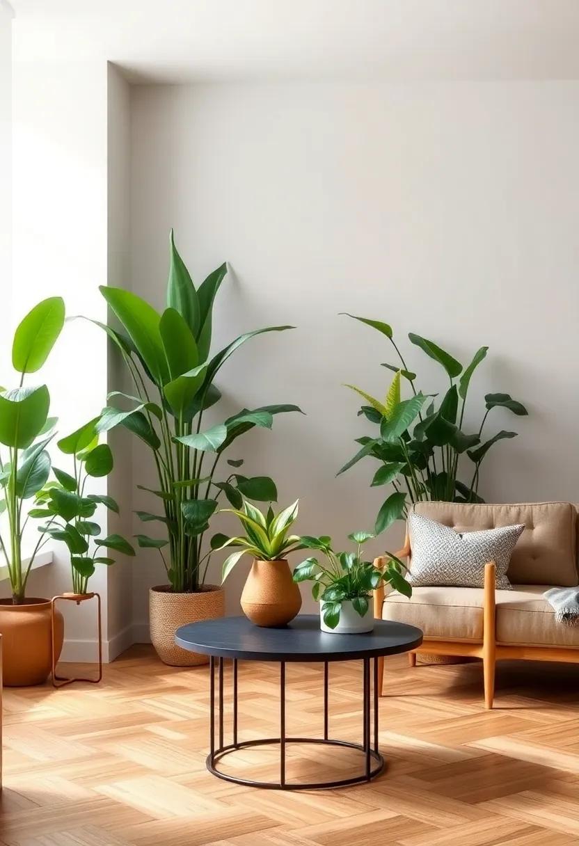 To arrange your plants effectively, you can create different layers and heights, establishing a visual rhythm that captivates the eye. You might opt for multi-level plant stands or hanging planters that emphasize the vertical space, drawing attention upward and making the room feel more expansive. Mix textures and colors by pairing ceramic pots with natural wood elements, or even using ornate metallic planters to amplify the luxe feel. Here’s a simple layout idea: