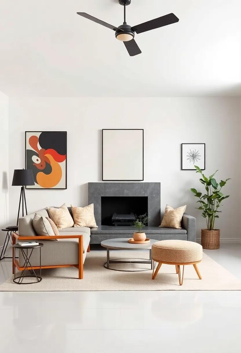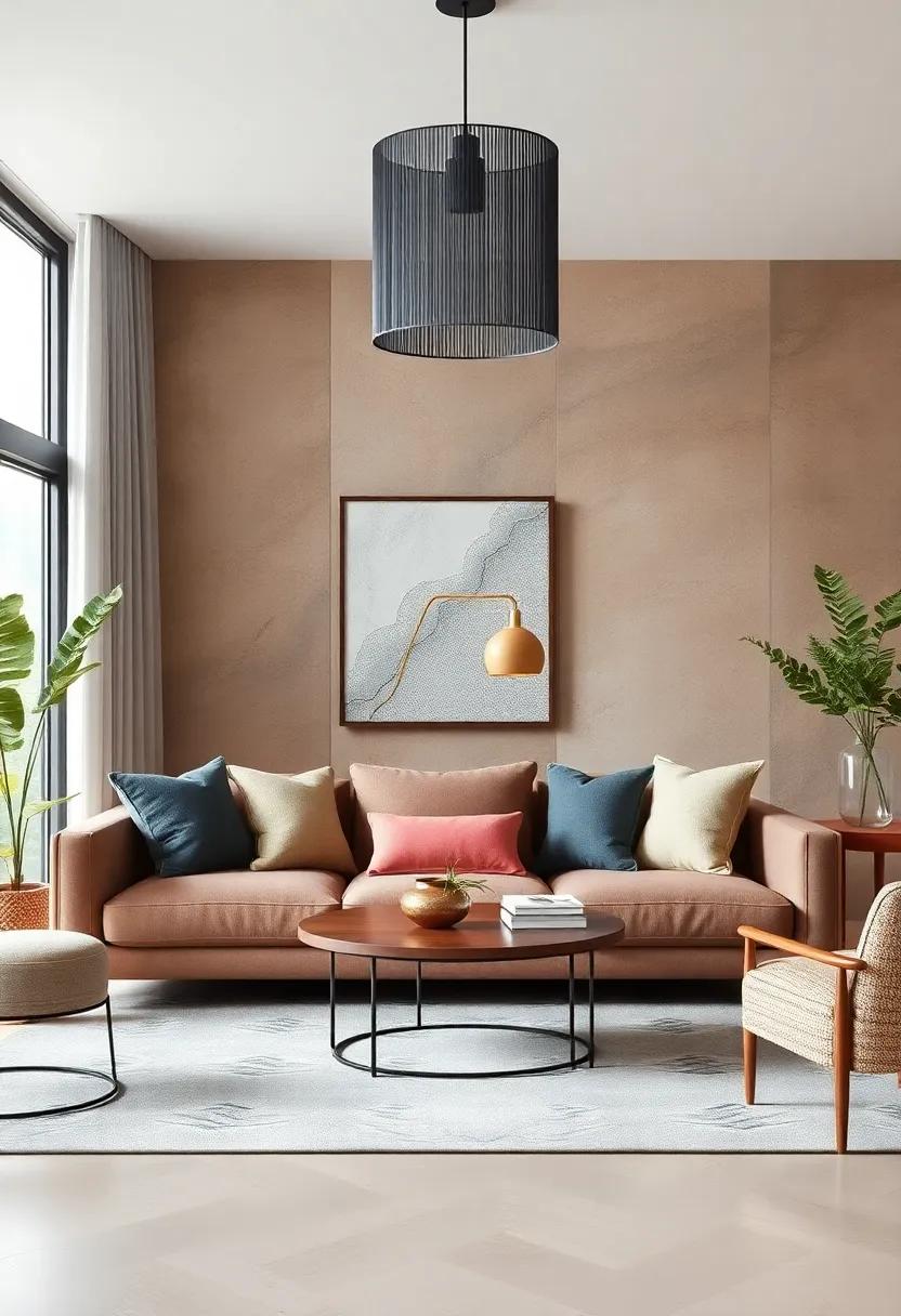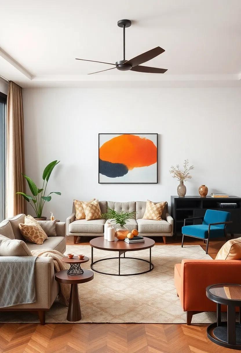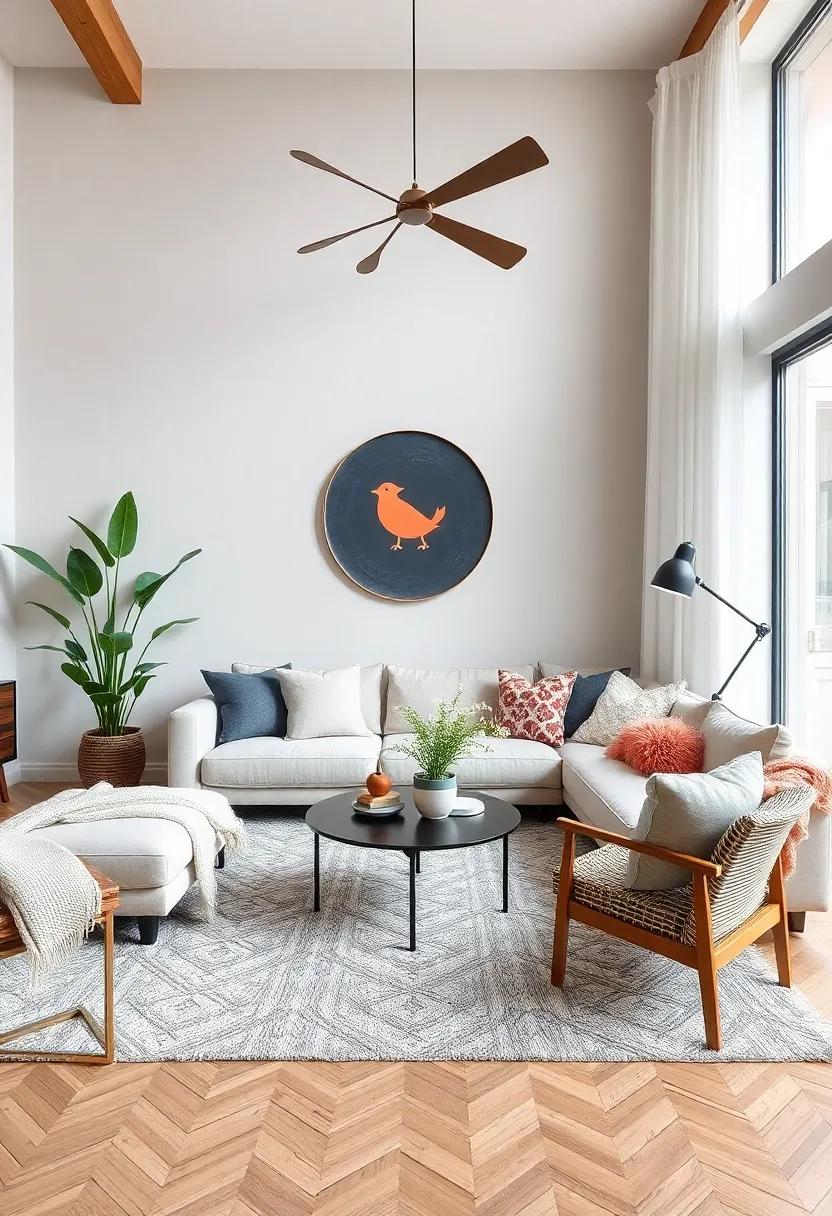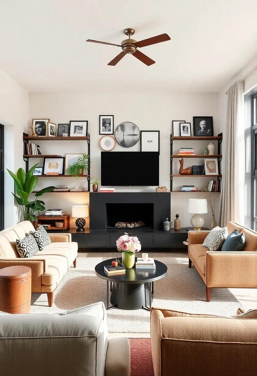 Complement these accessories with a selection of unique light fixtures that stand out, such as chandeliers made from unconventional materials or playful pendant lights crafted in fun shapes. Incorporating eccentric coffee tables—like those with mismatched legs or brightly painted surfaces—can create focal points that bring your eclectic style to life. To enhance the effect, display your whimsical treasures in creative clusters, allowing each piece to highlight the others and transform your living room into a joyous celebration of bold artistic expression.