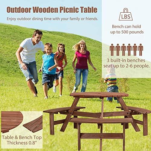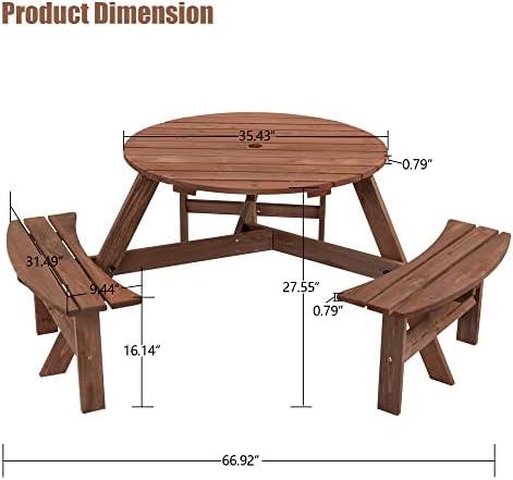 Upon our first encounter with the outdoor dining set, we were impressed by its elegant design and sturdy construction. The set features a large round table complemented by three curved benches, creating an inviting atmosphere suitable for both casual gatherings and more formal dining experiences. The rich brown fir wood offers a natural, warm touch, enhancing the aesthetic of any backyard, lawn, or poolside setting. With a diameter of 35.43 inches, the tabletop provides ample space for meals, and we particularly appreciated the umbrella hole, allowing us to enjoy outdoor dining even under the sun or light rain, making it versatile for various weather conditions.