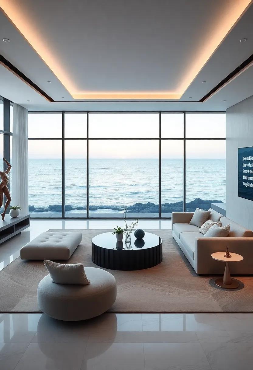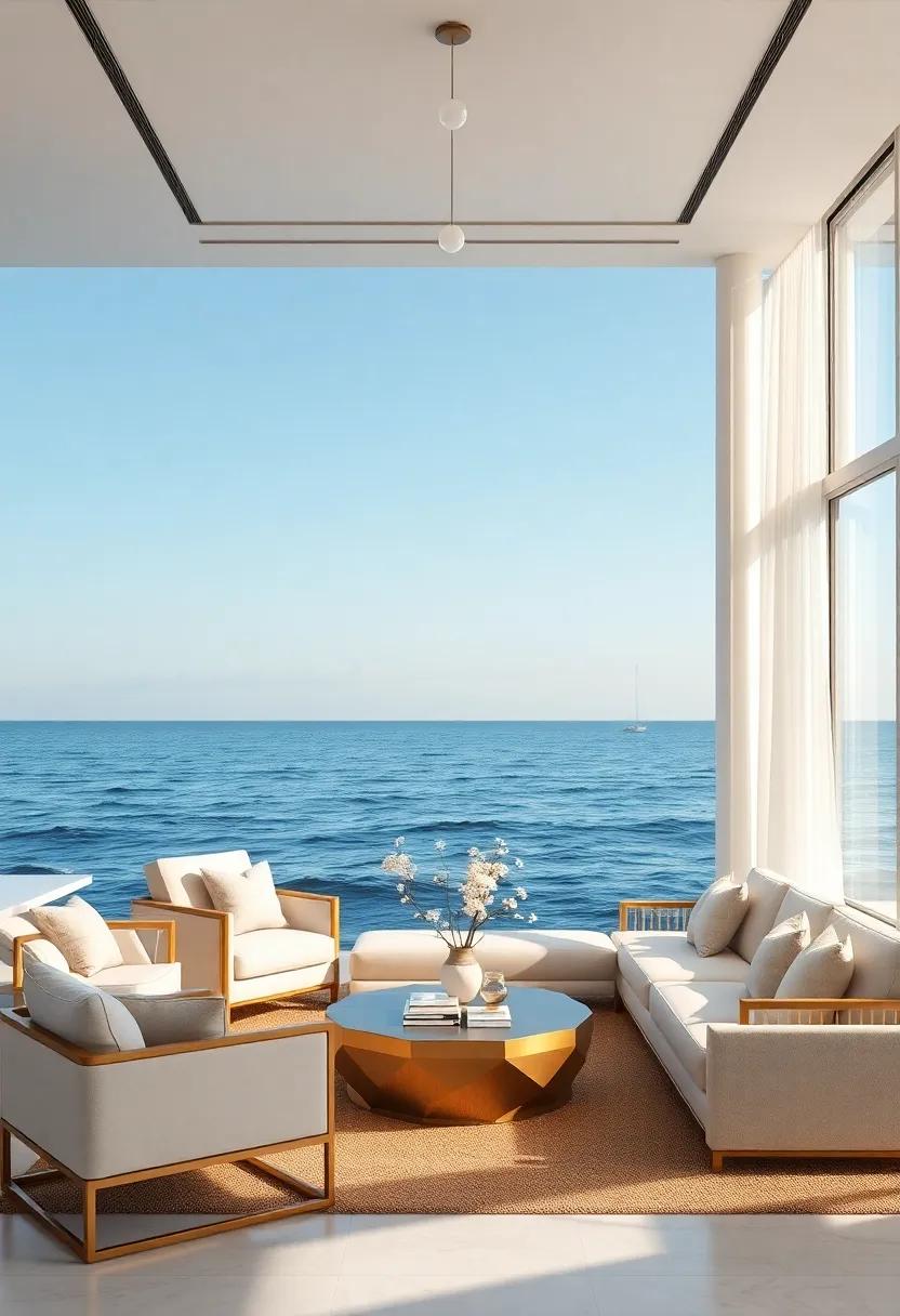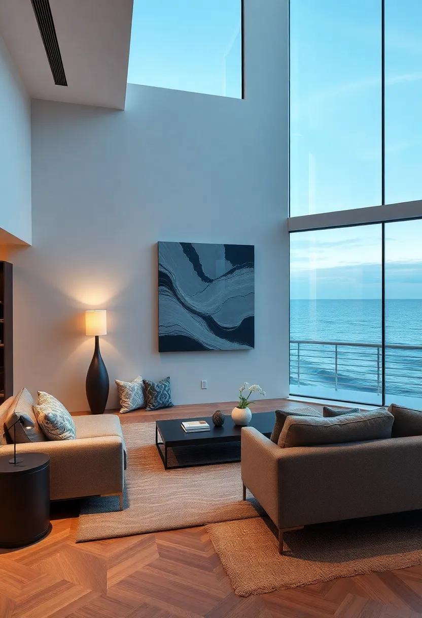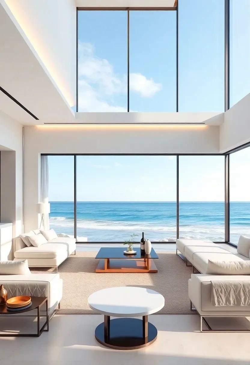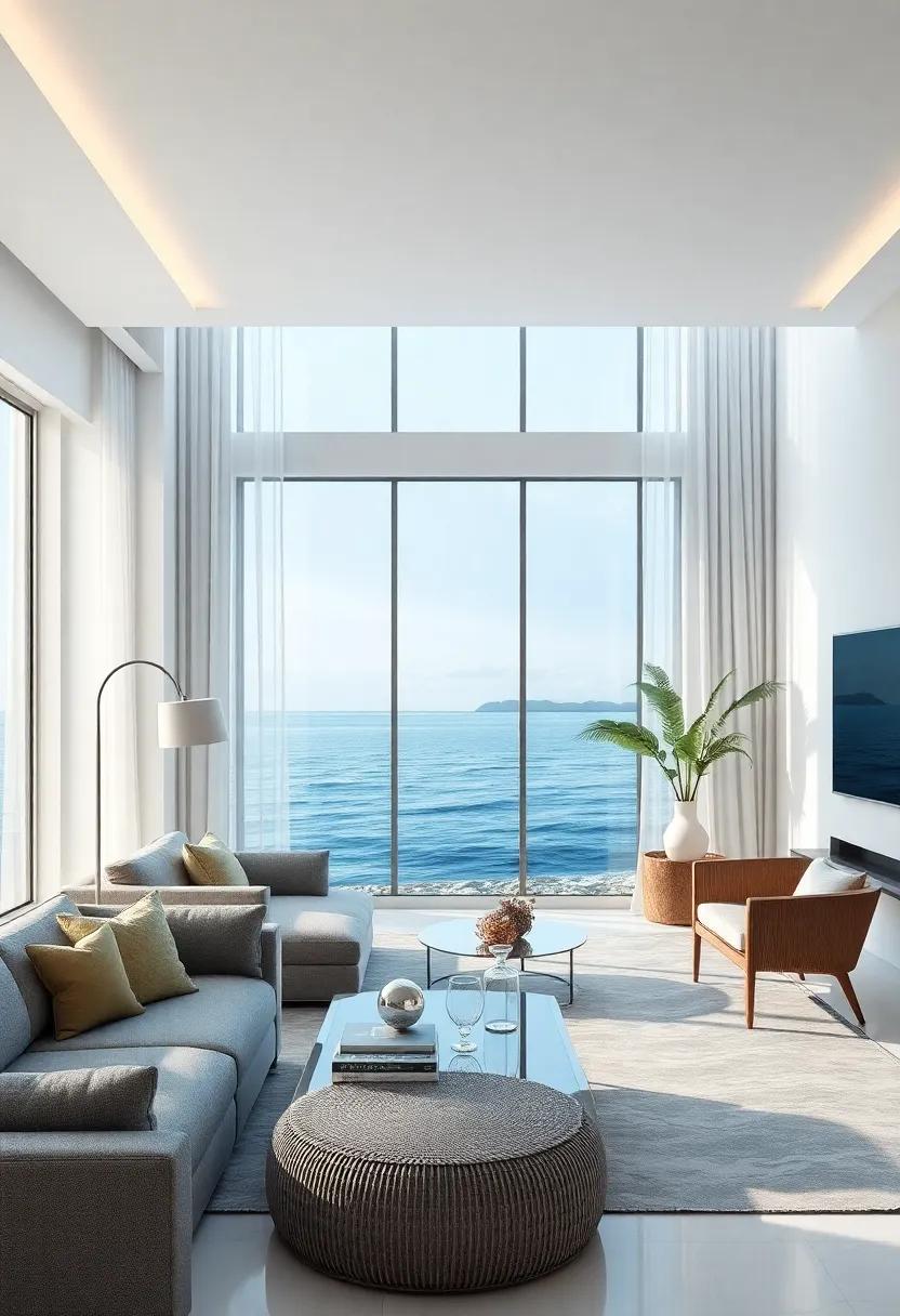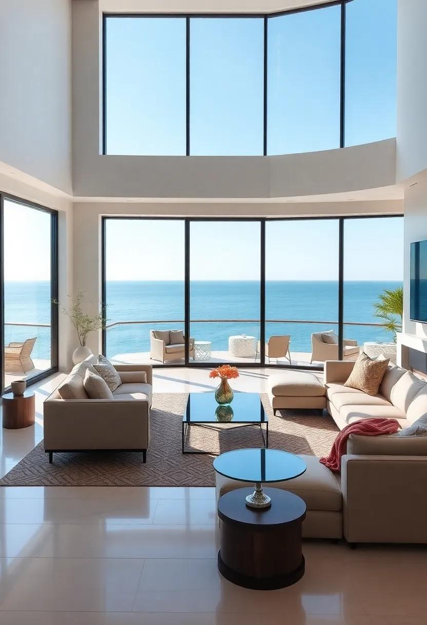 Integrating large windows not only amplifies the beauty of the ocean backdrop but also contributes to the ambiance by creating a seamless flow between nature and interior design. To further enhance this blend, consider using a color palette inspired by the ocean—soft blues, sandy beiges, and crisp whites can echo the coastal theme, making the room feel expansive and full of light. A well-planned layout can ensure that seating arrangements do not obstruct the view, fostering a sense of openness, tranquility, and elegance.Below is an example of inspired color schemes and textures for your living space: