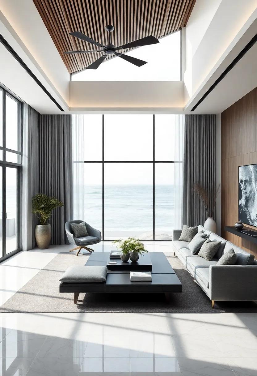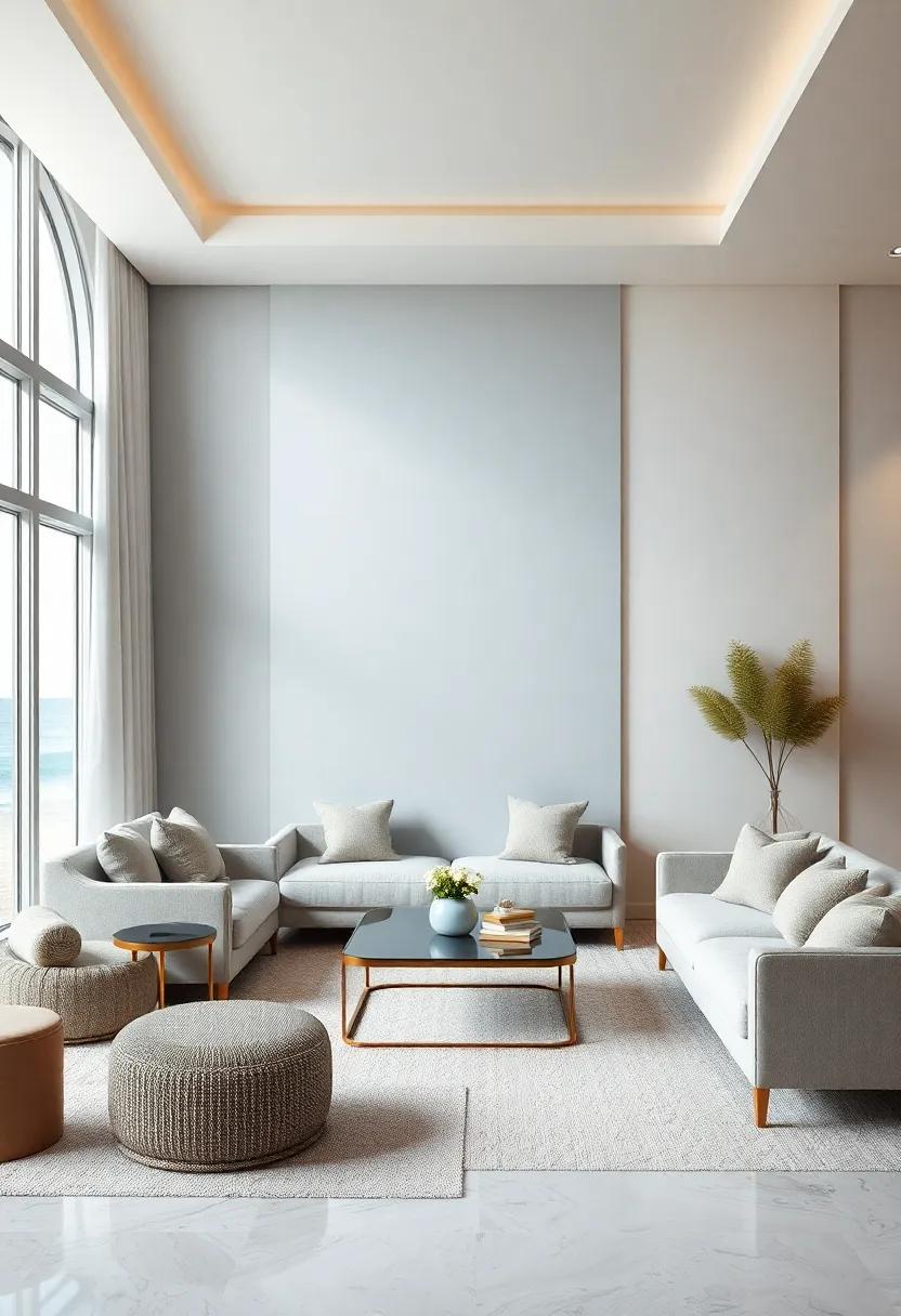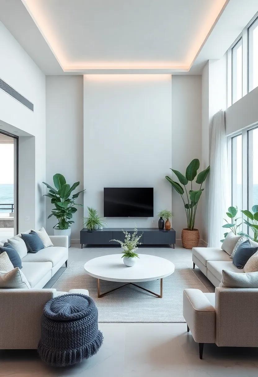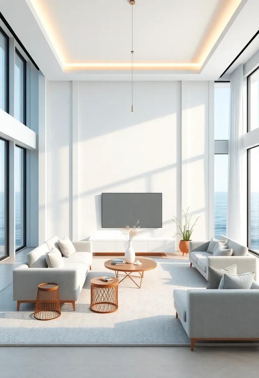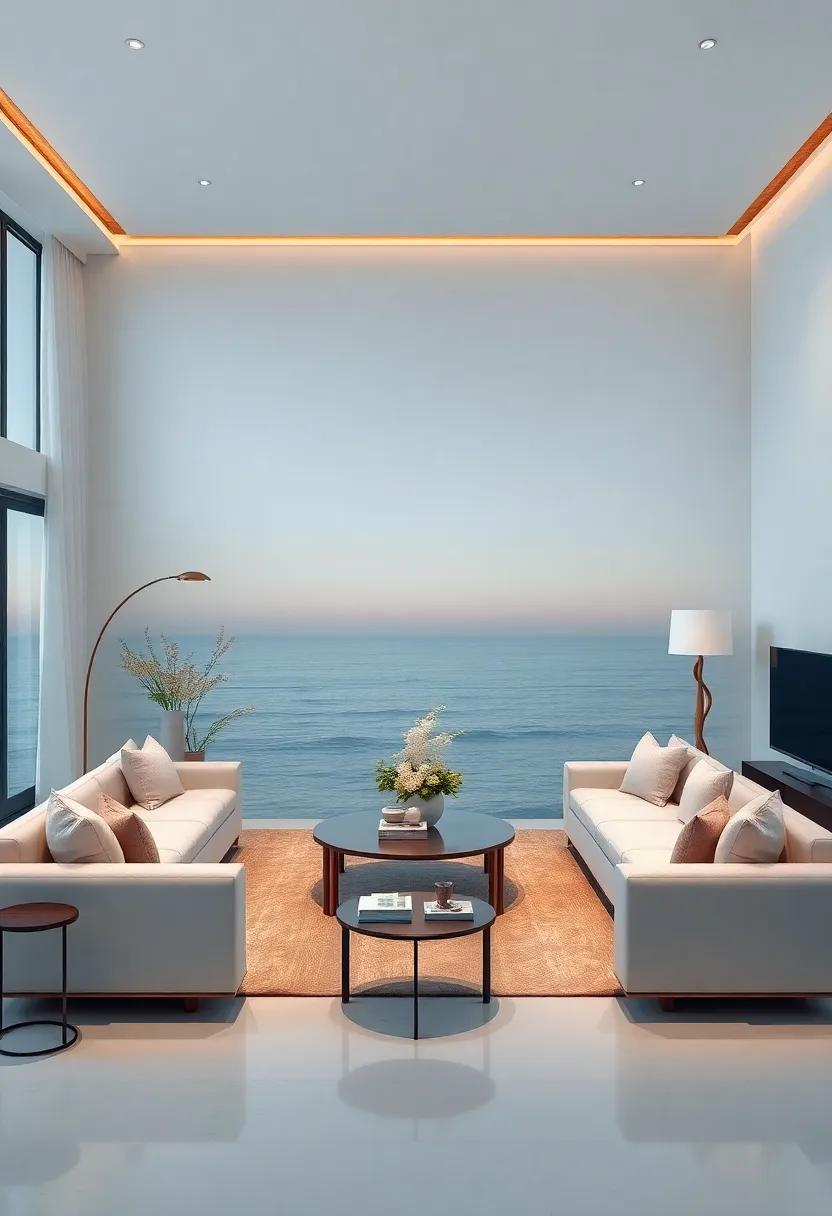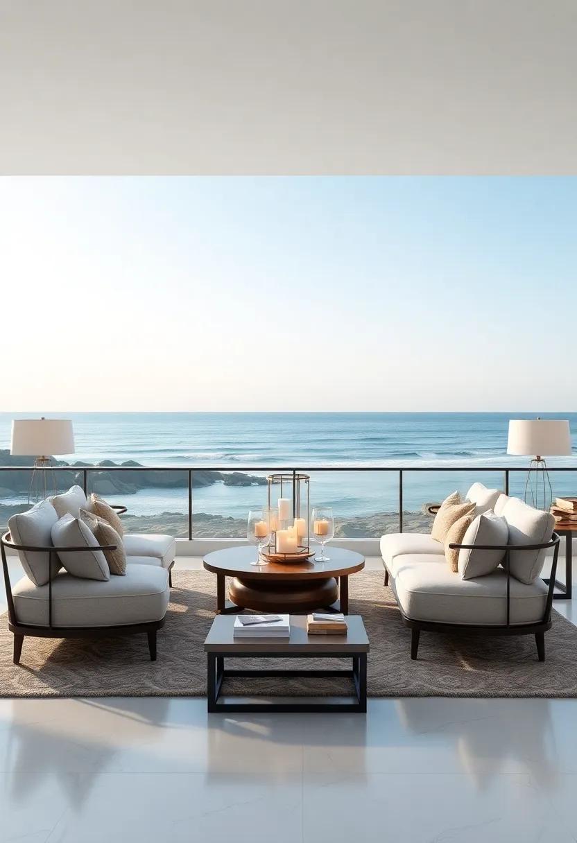 Integrating large windows not only amplifies the beauty of the ocean backdrop but also contributes to the ambiance by creating a seamless flow between nature and interior design. To further enhance this blend, consider using a color palette inspired by the ocean—soft blues, sandy beiges, and crisp whites can echo the coastal theme, making the room feel expansive and full of light. A well-planned layout can ensure that seating arrangements do not obstruct the view, fostering a sense of openness, tranquility, and elegance.Below is an example of inspired color schemes and textures for your living space:
