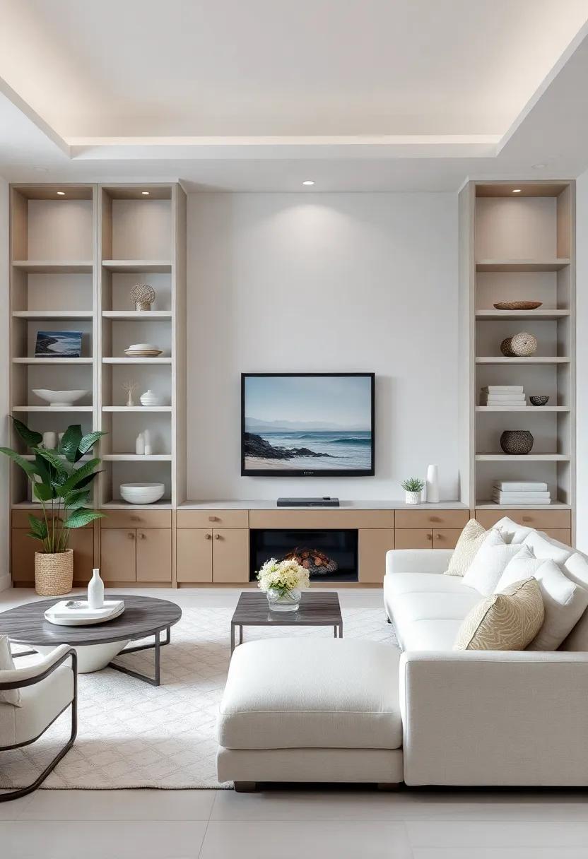 to create a stunning focal point that reflects your affinity for the ocean, consider designing custom shelving that elegantly displays your coastal treasures. Start by choosing materials that echo the natural elements of the shore, such as driftwood, sea glass, and light-hued woods. Utilize open shelving designs that allow your items to be the stars of the show. Incorporate a color palette inspired by the sea, with soft blues, sandy beiges, and crisp whites enhancing the overall aesthetic.This approach not only accents your coastal collections but also opens up space, giving your living room a breezy, airy feel.