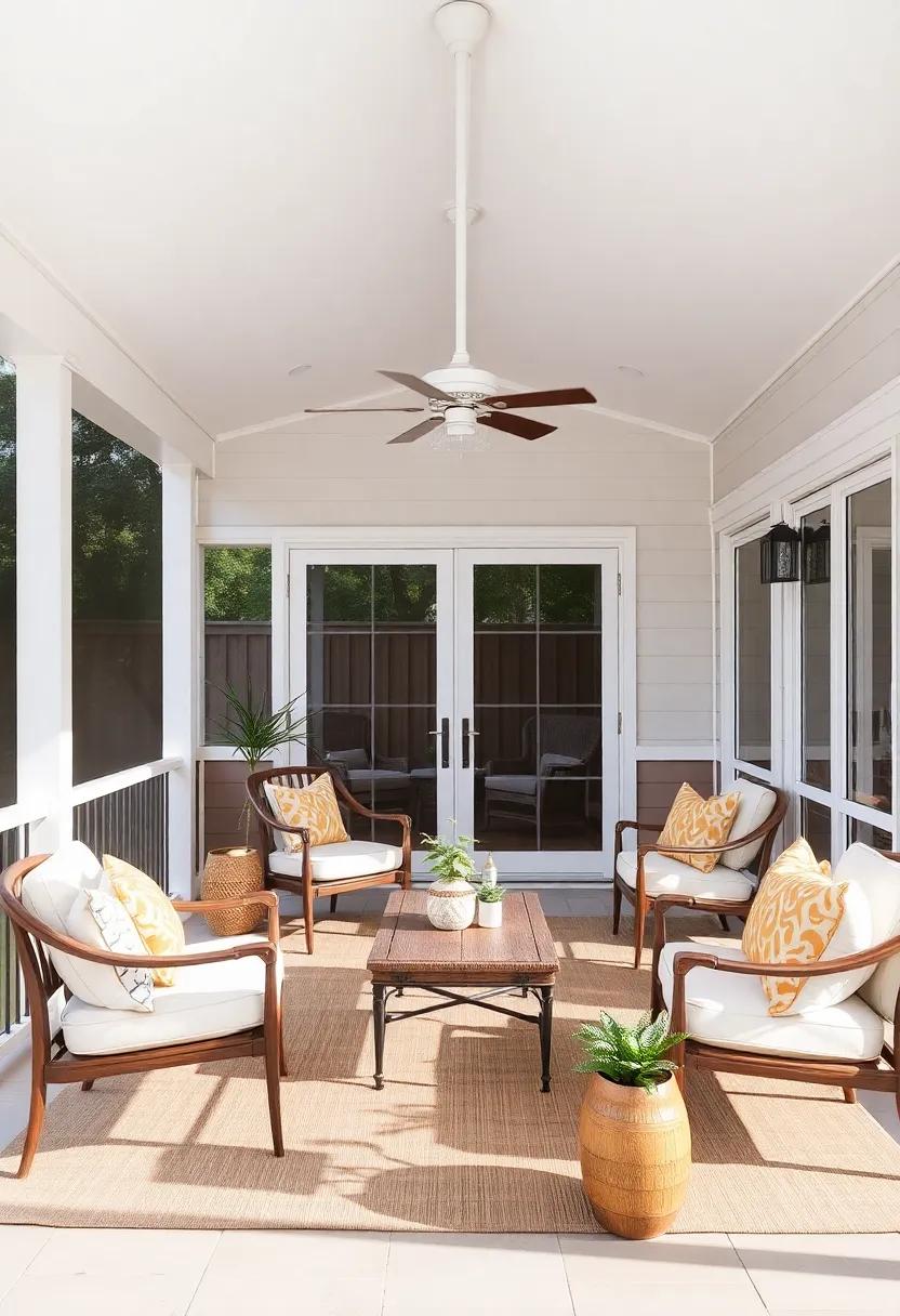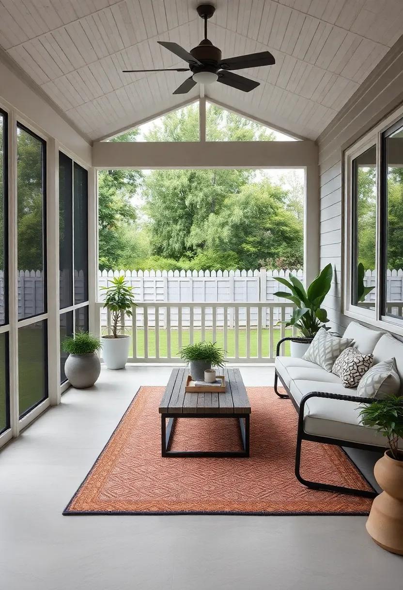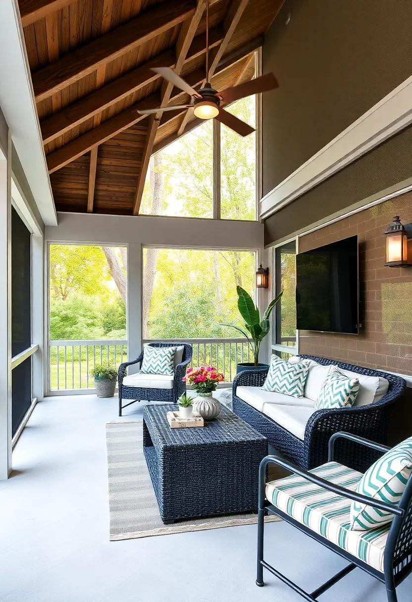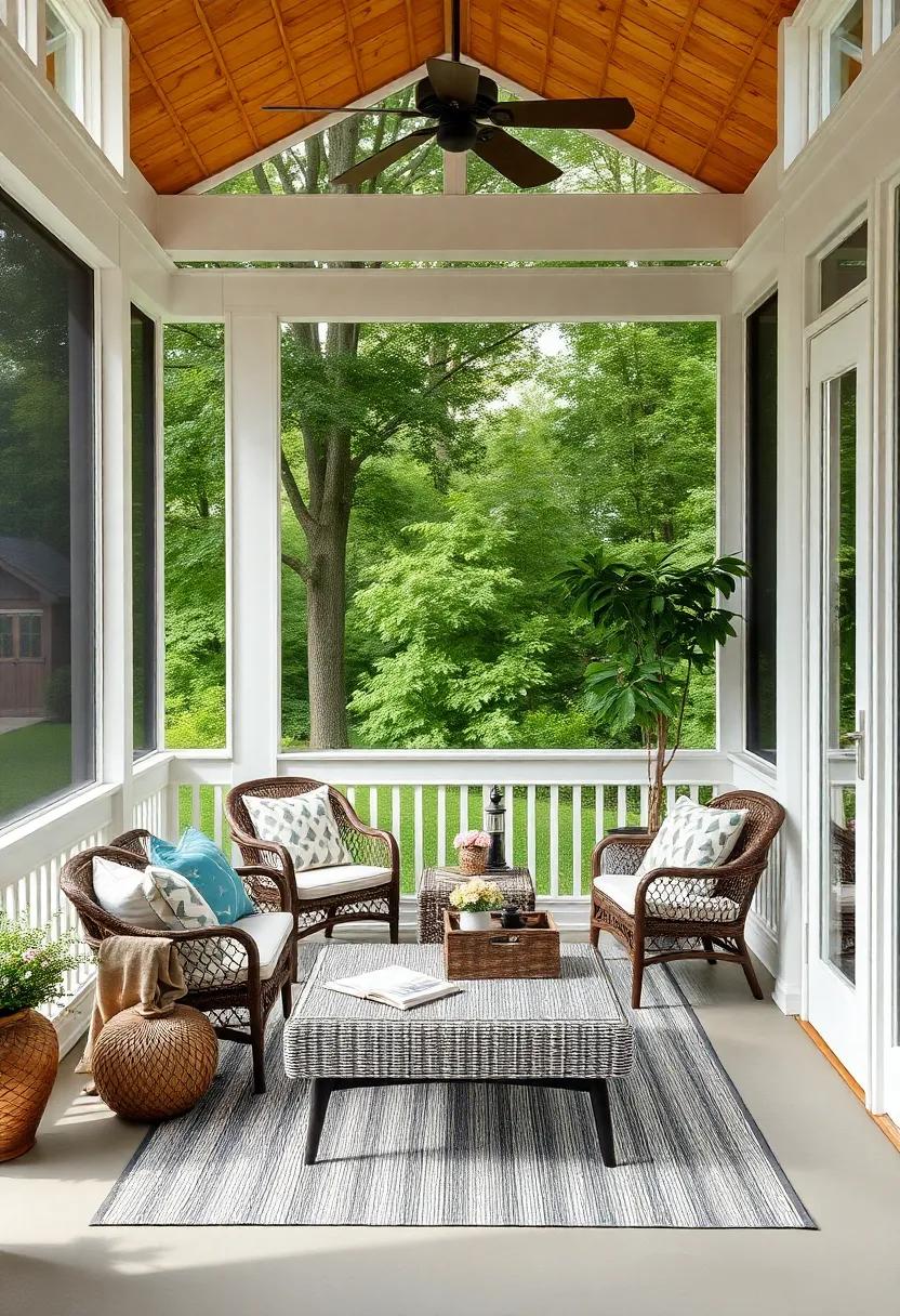 To elevate the charm, accessorize with multifunctional storage solutions.Look for benches or ottomans with hidden compartments to keep your porch tidy and organized. Additionally, introduce a hanging chair or two for a playful element that adds character. Incorporate vibrant outdoor rugs to define areas and add warmth, while also making the space more inviting. Don’t forget the finishing touches—lamps or candles that are weatherproof can create a magical ambiance in the evenings. With these stylish furniture choices, your screened back porch will become an extension of your home that offers both comfort and functionality.