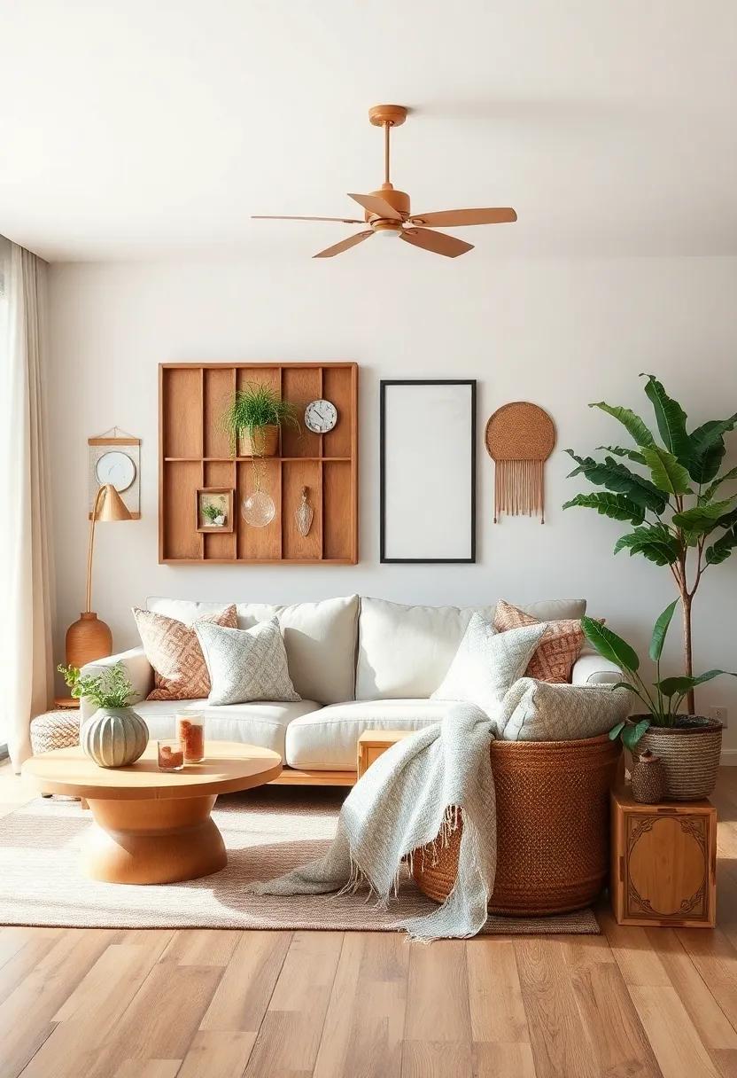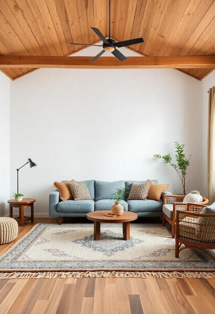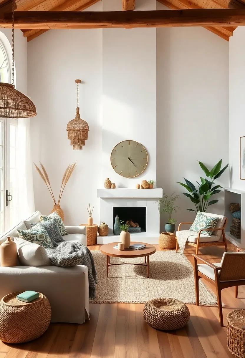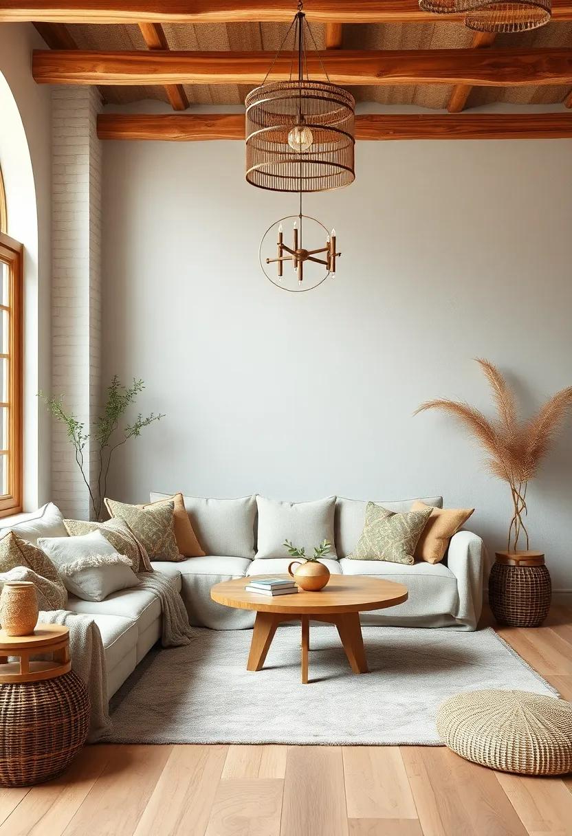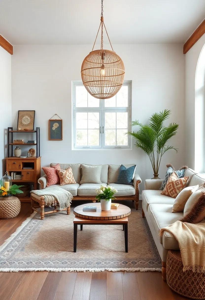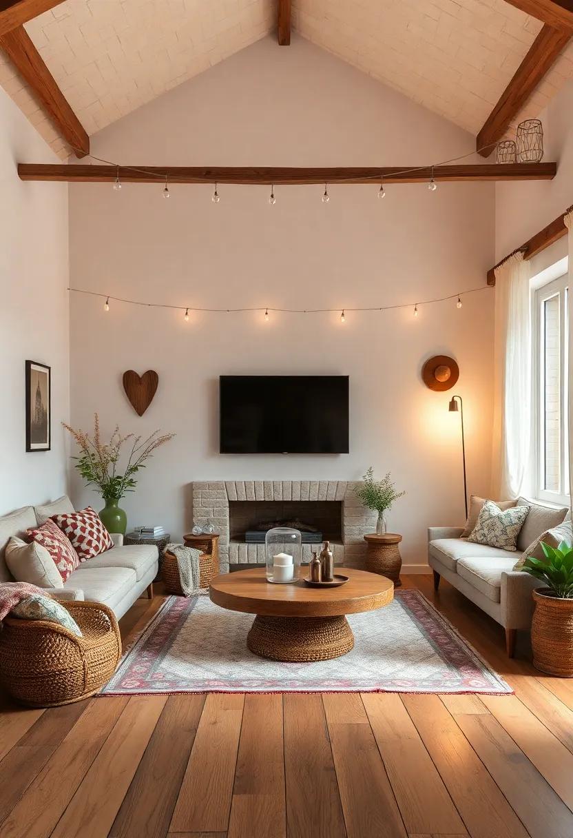 Incorporating organic materials and a light color palette will further enhance the tranquil ambiance of a Bohemian rustic living room. Natural wood, stone accents, and textiles in creamy whites and soft earth tones can balance the light, creating a cohesive retreat. Pairing these elements with plants can enliven the space, providing a refreshing connection to nature. To visualize a harmonious integration of these ideas, consider the following layout: