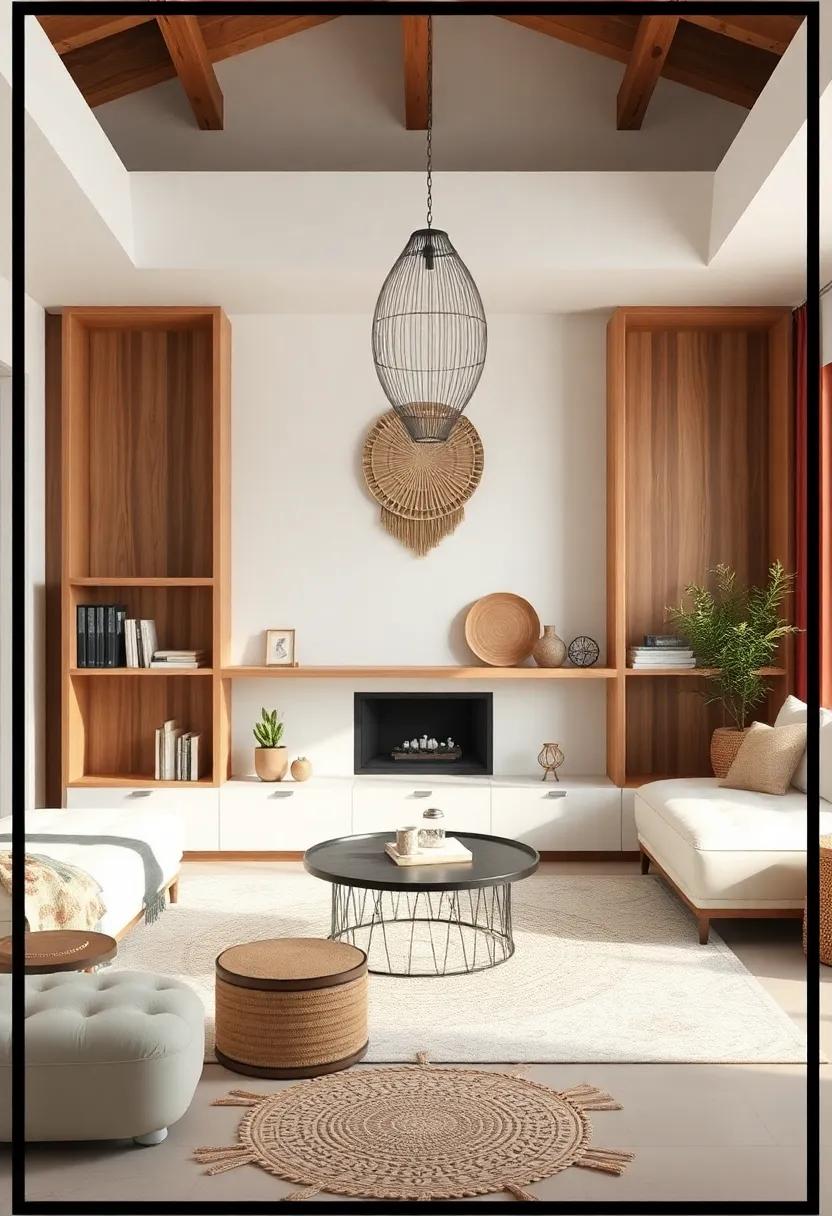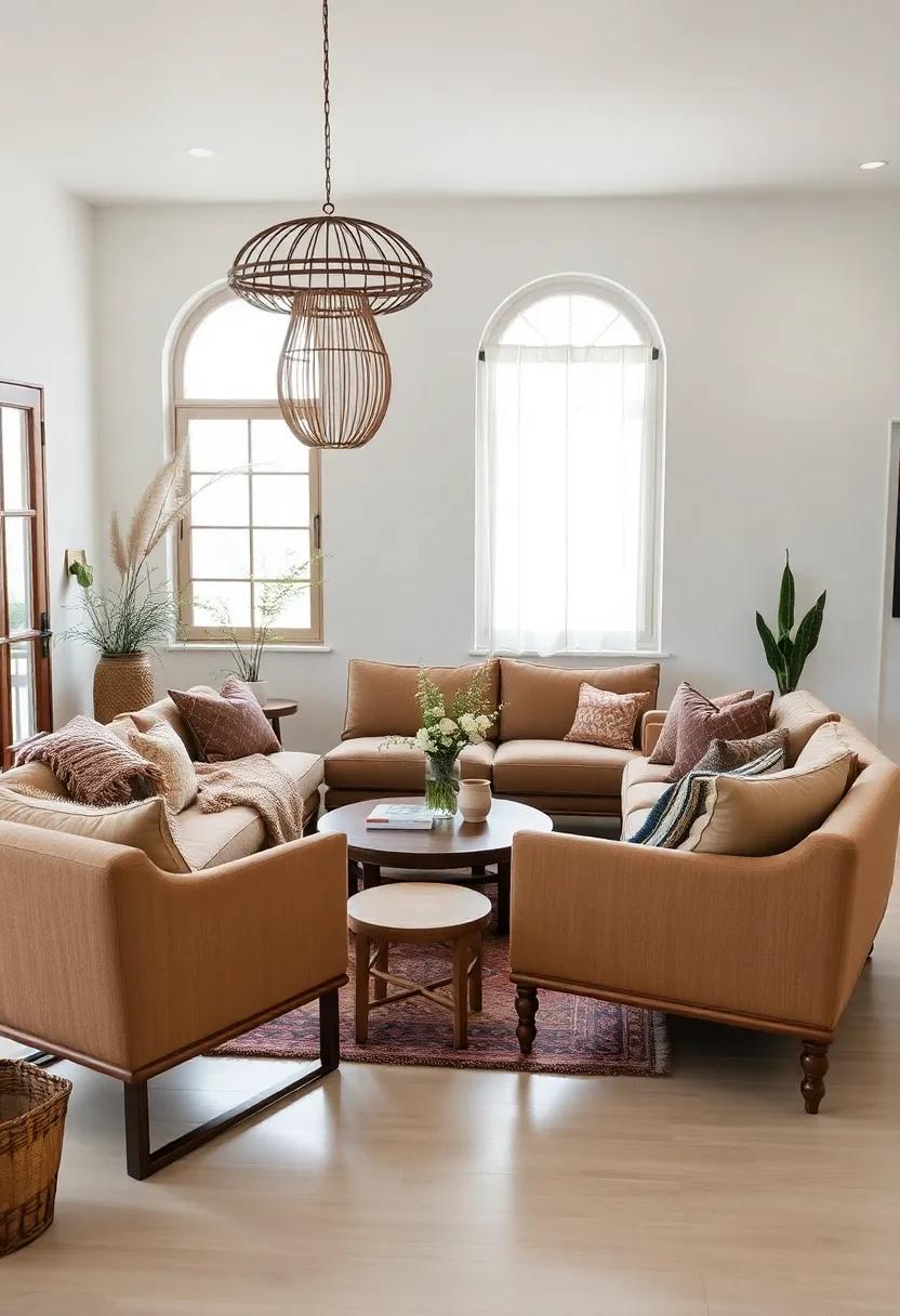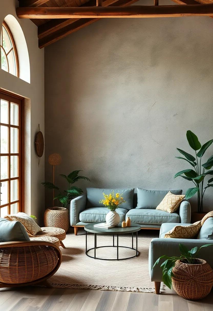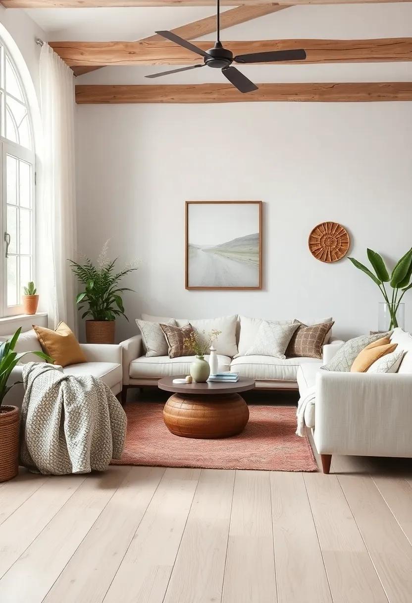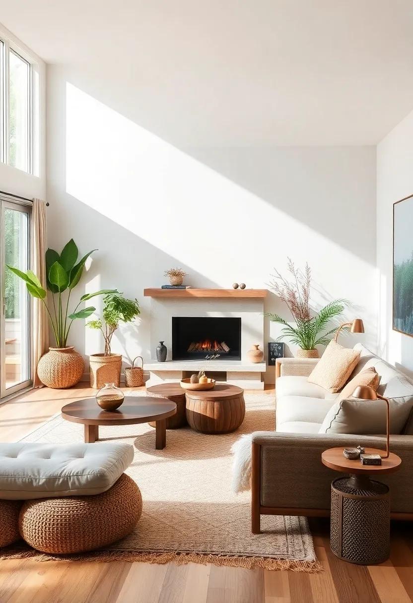Incorporating organic materials and a light color palette will further enhance the tranquil ambiance of a Bohemian rustic living room. Natural wood, stone accents, and textiles in creamy whites and soft earth tones can balance the light, creating a cohesive retreat. Pairing these elements with plants can enliven the space, providing a refreshing connection to nature. To visualize a harmonious integration of these ideas, consider the following layout: