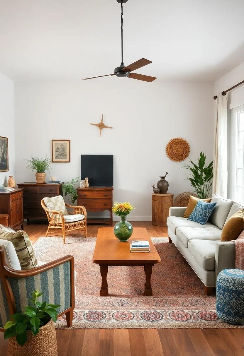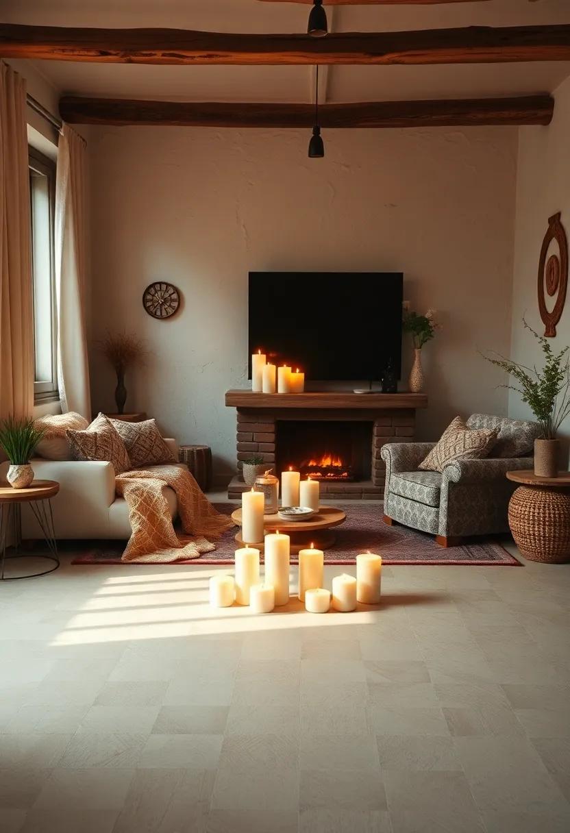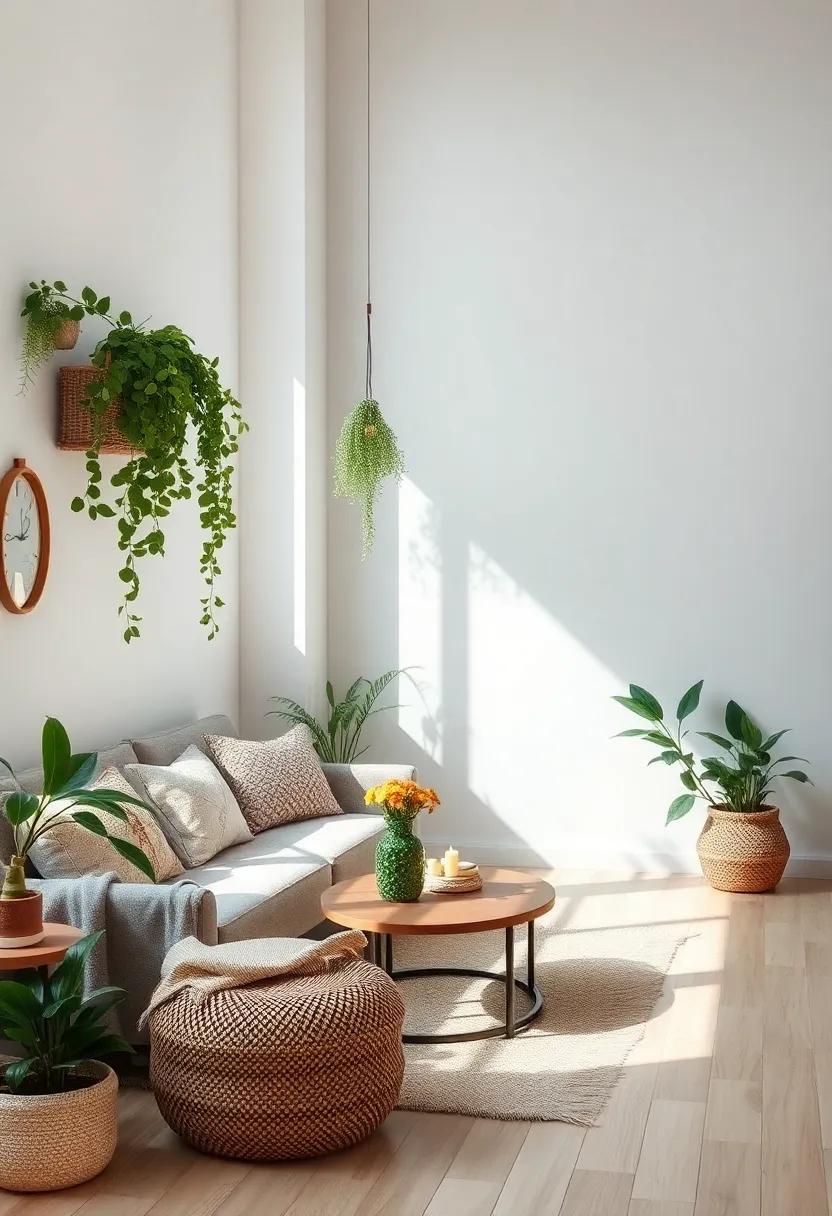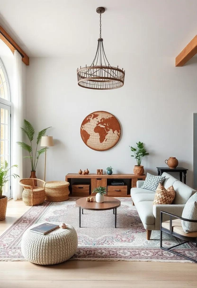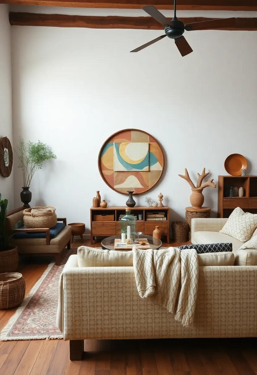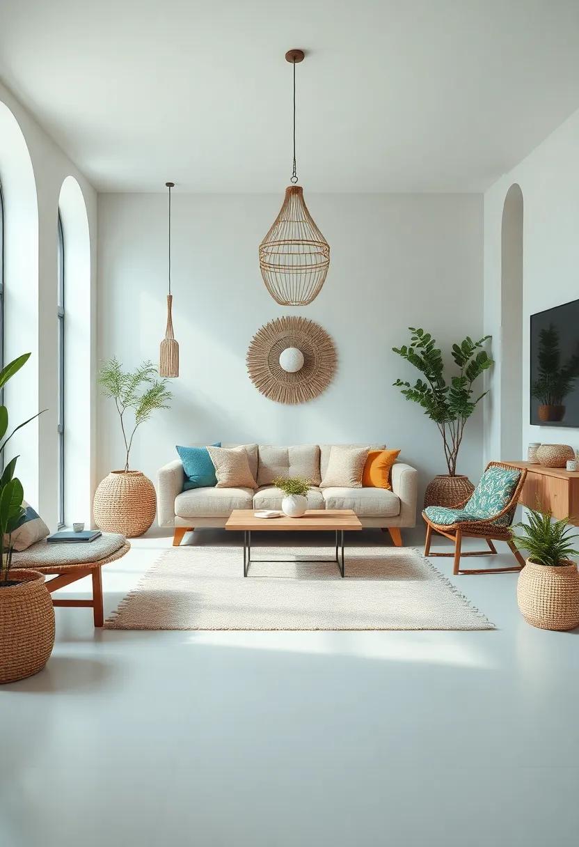 Incorporating organic materials and a light color palette will further enhance the tranquil ambiance of a Bohemian rustic living room. Natural wood, stone accents, and textiles in creamy whites and soft earth tones can balance the light, creating a cohesive retreat. Pairing these elements with plants can enliven the space, providing a refreshing connection to nature. To visualize a harmonious integration of these ideas, consider the following layout: